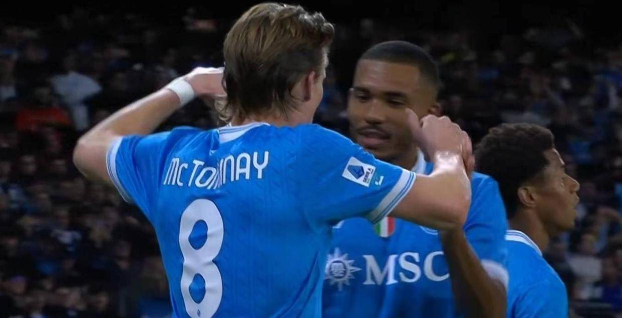 麦克托米奈不等皮球落地,直接凌空抽射,皮球划出一道美妙的弧线后钻入球门远角,将比分扩大为2比0。